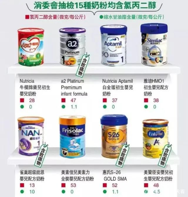 8月17日,香港消费者委员会发布雀巢、美赞臣、明治、雪印、a2、喜宝、雅培等15款预先包装初生婴儿配方奶粉的检测报告。测试结果显示,这15款奶粉售价为250元至539元不等,其中均含有污染物氯丙二醇。这是一种致癌物,食用过量可能损害肾功能及男性生殖能力。同时,9款奶粉样本中含有缩水甘油酯,其具有基因毒性和致癌性,原则上应该尽量少摄入。